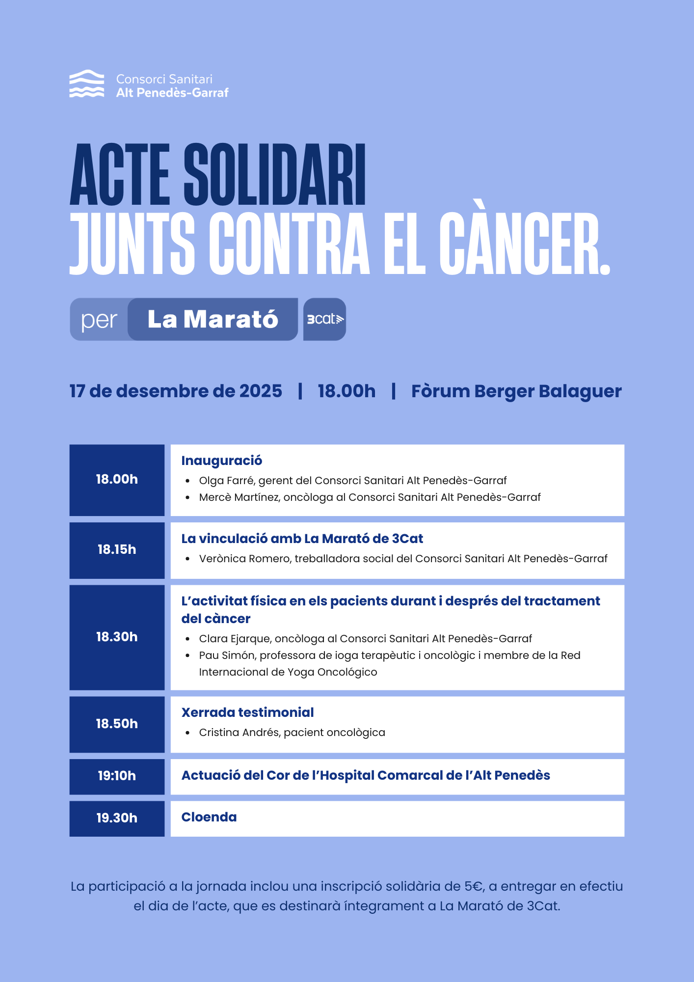El proper 17 de desembre de 2025, el Consorci Sanitari Alt Penedès-Garraf organitza un acte solidari en suport a La Marató de 3Cat, dedicada enguany a la lluita contra el càncer, una de les principals causes de mort a Catalunya i a tot el món. Es tracta d'una jornada pensada per sumar energia, visibilitat i recursos destinats a impulsar la recerca i millorar la vida de les persones afectades per aquesta malaltia.
