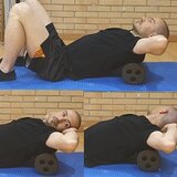 Panxa amunt, amb els genolls flexionats, col·loquem amb un foam a nivell dorsal. Les mans entrecreudes darrera el cap per subjectar-lo recte. Colzes oberts