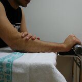 Recolzem avantbraç en una taula, el podem fixar amb la nostra mà contrària perquè no es mogui, i portem el dors de la mà amunt el màxim que puguem.