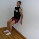 Recolzat contra la paret amb els genolls semiflexionats, anem baixant fins que quedin a 90º mantenint la posició el temps que podem i tornem a pujar.
