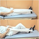 Estirats panxa amunt, separem la cama lesionada fent-la lliscar sobre el llit. Tornem a la posició inicial. Repetim l’exercici.