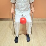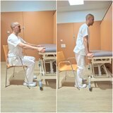 Asseguts, separem l’esquena del respatller de la butaca o cadira (flexionem el tronc endavant) amb les mans recolzades als recolzabraços de la butaca. Fem força amb les mans i les camens per aixecar la pelvis del seient. Tornem a la posició inicial. Repetim l’exercici.