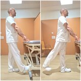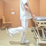 Ens posem drets davant d'una taula o barana on ens puguem recolzar. Recolzem el pes a la cama sana i desplacem endavant i enrere l’extremitat lesionada . Repetim l'exercici.