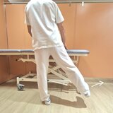 Ens posem drets davant d'una taula o barana on ens puguem recolzar. Posem el pes a la cama sana i separem la cama lesionada. Repetim l’exercici.