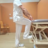 Ens posem drets davant d'una taula o barana on ens puguem recolzar. Recolzem el pes a la cama sana i fem flexió de maluc de la cama lesionada amb el genoll doblegat. Repetim l’exercici.